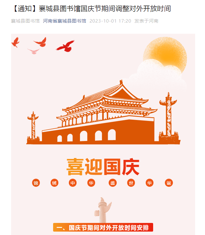 【通知】襄城县图书馆国庆节期间调整对外开放时间