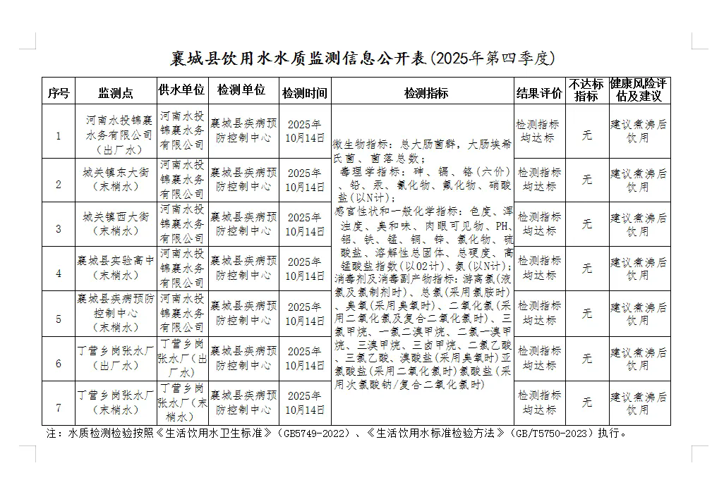 附表:襄城县饮用水水质监测信息公开表(2025年第四季度)