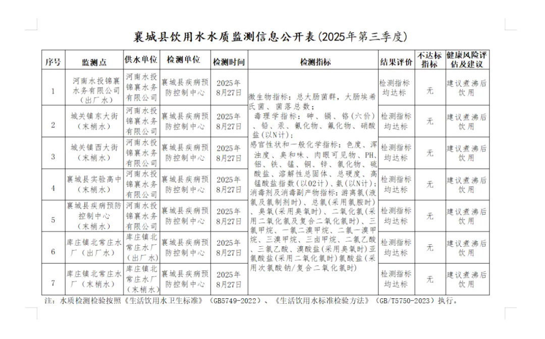附表:襄城县饮用水水质监测信息公开表(2025年度第三季度)