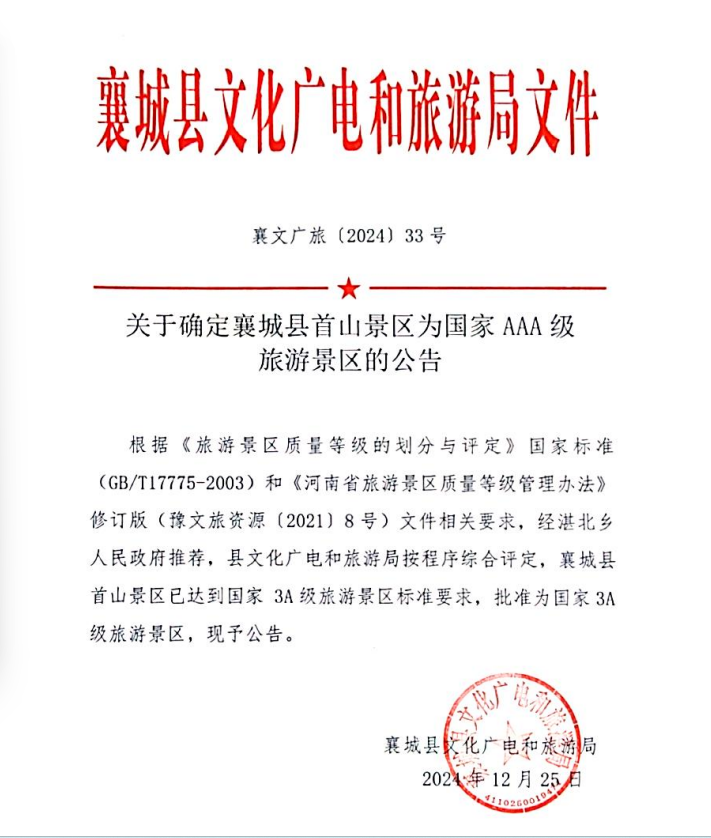 关于确定襄城县首山景区为国家AAA级旅游景区的公告
