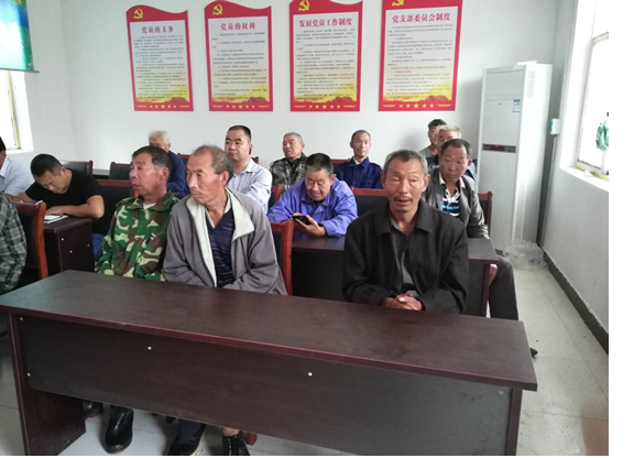 参会的党员、群众和贫困户代表认真学习扶贫政策和扫黑除恶知识