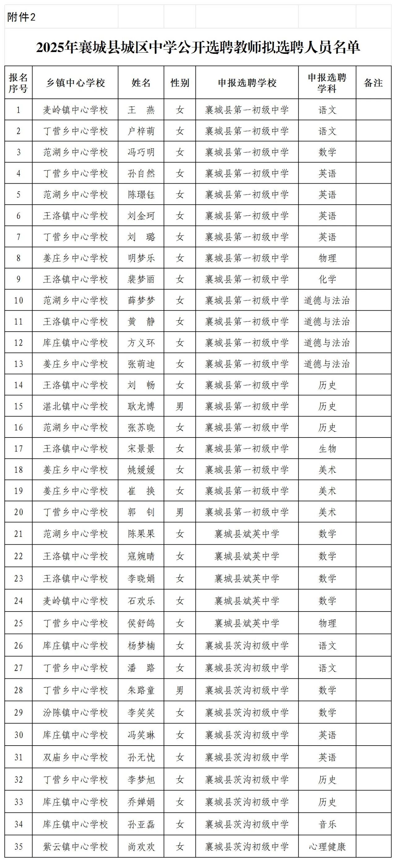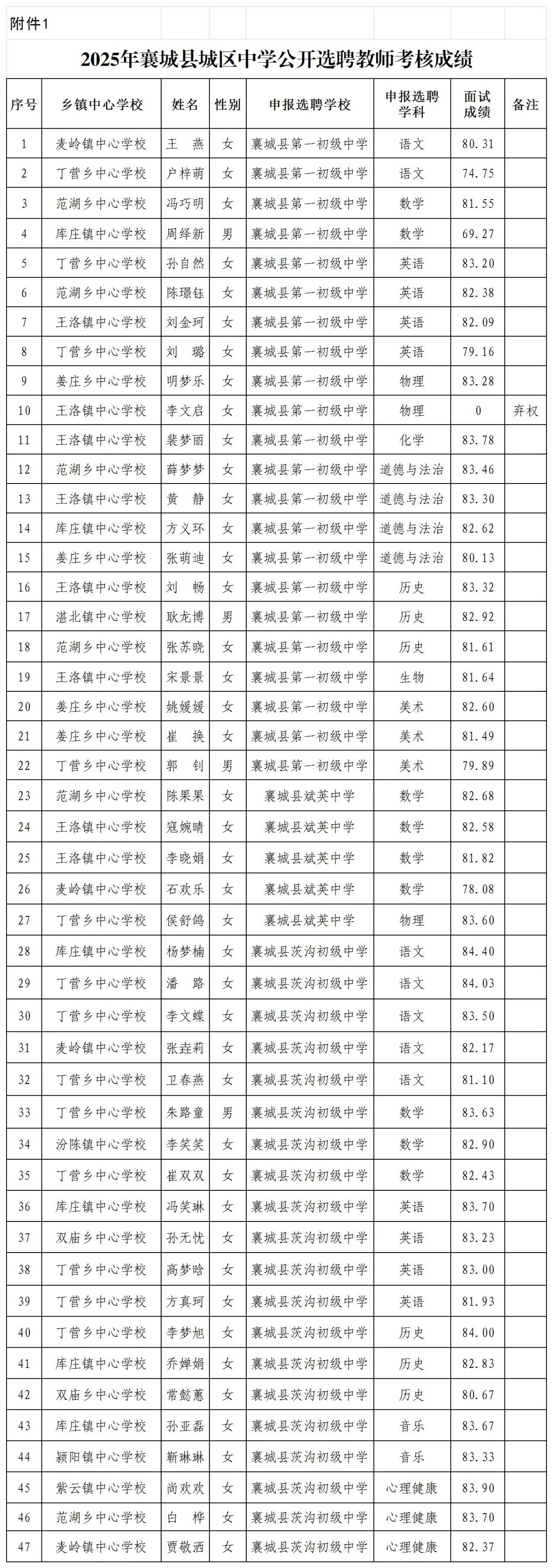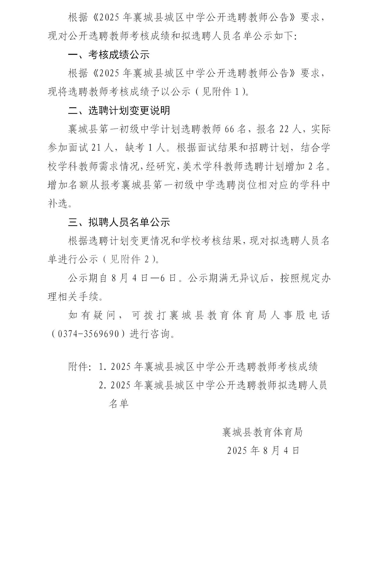 2025年襄城县城区中学公开选聘教师考核成绩和拟选聘人员名单公示