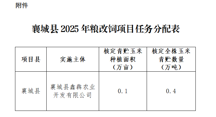 2025年,完成粮改饲青贮玉米种植面积0.1万亩、全株青贮玉米0.4万吨(见附件)。