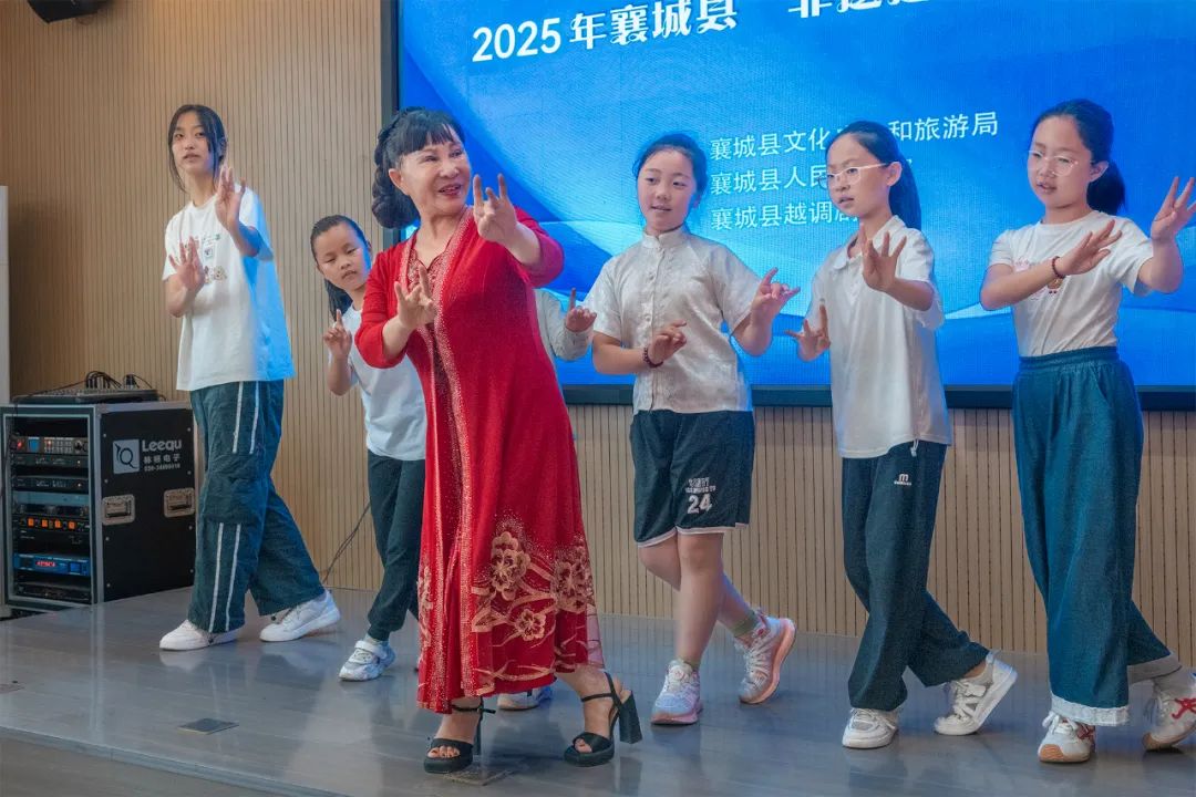 是日,文昌小学东城校区培训室里方爱枝、张秋香、牛芳、赵少阳、任艳明等襄城越调市、县级非遗代表性传承人通过“知识讲授+戏曲表演+互动教学”相结合的形式,点燃了学生们对传统戏曲的浓厚兴趣,孩子们踊跃登台,在传承人指导下,甩水袖、亮身段、学唱腔,一招一式尽显戏曲神韵。