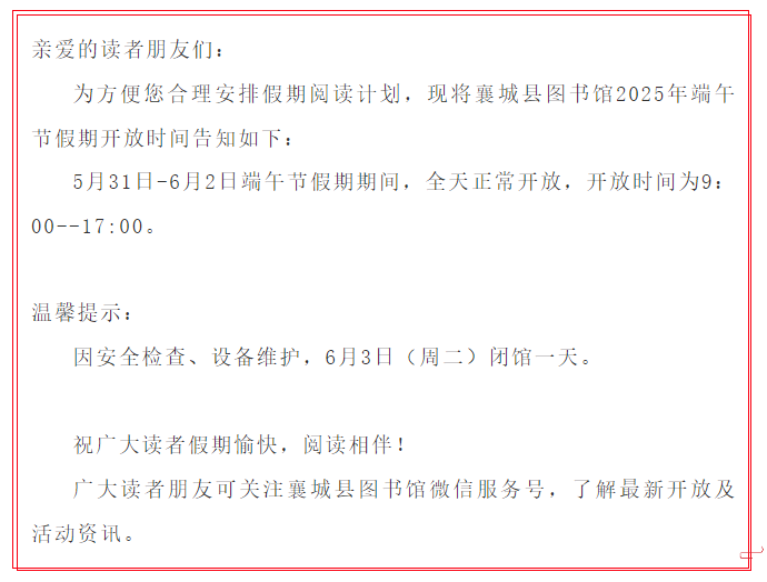 襄城县图书馆关于2025年端午节假期开放时间的通知