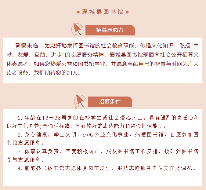 茨沟街道转发《襄城县图书馆暑假志愿者招募公告》