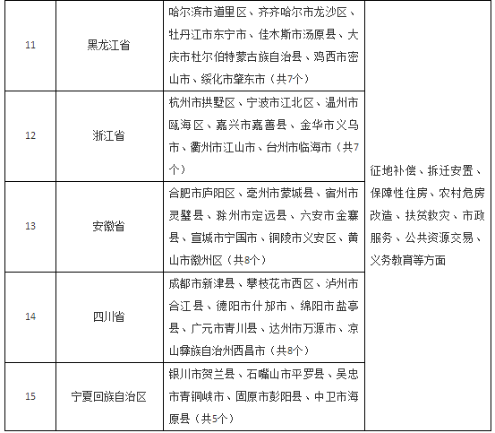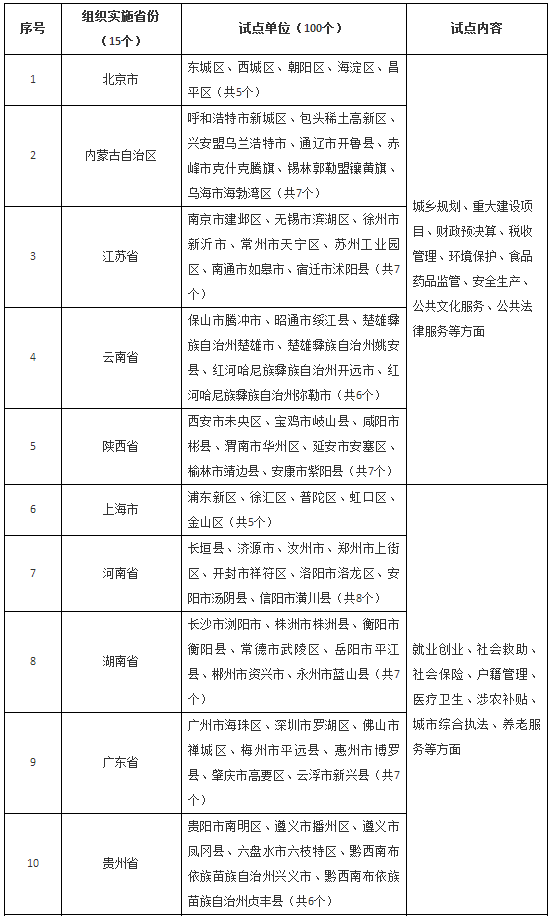 根据各地区实际情况和政务公开工作基础,确定在北京市、安徽省、陕西省等15个省(区、市)的100个县(市、区)(以下称试点单位),重点围绕城乡规划、重大建设项目、公共资源交易、财政预决算、安全生产、税收管理、征地补偿、拆迁安置、保障性住房、农村危房改造、环境保护、公共文化服务、公共法律服务、扶贫救灾、食品药品监管、城市综合执法、就业创业、社会保险、社会救助、养老服务、户籍管理、涉农补贴、义务教育、医疗卫生、市政服务等方面开展试点工作(《试点单位及试点内容表》附后)。承担试点任务的省(区、市)在做好试点工作的同时,可以结合实际适当增加试点内容。